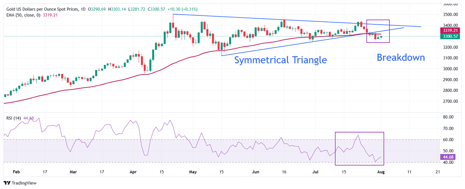 El precio del Oro rebota para volver a probar la región de ruptura de la formación de Triángulo Simétrico alrededor de 3.320$. La Media Móvil Exponencial (EMA) de 50 días actúa como una barrera clave para el precio del oro alrededor de 3.320$.