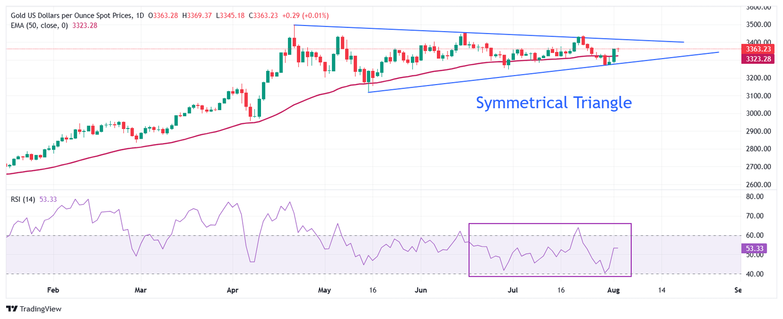El precio del Oro rebota por encima de la Media Móvil Exponencial (EMA) de 20 días, que cotiza en torno a los 3.323$. La tendencia general del precio del Oro sigue siendo lateral mientras cotiza dentro de la formación del Triángulo Simétrico, lo que indica indecisión entre los participantes del mercado.
