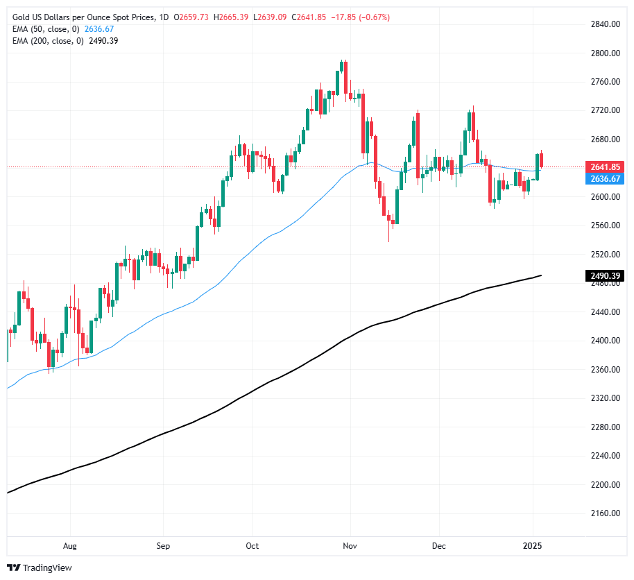 El XAU/USD cayó el viernes, con los precios del oro bajando aproximadamente dos tercios de un por ciento y retrocediendo por debajo de 2.650$ por onza a medida que el sentimiento del mercado se recupera del apetito de aversión al riesgo de principios de semana. Ha sido un comienzo inestable para los mercados globales durante la primera semana de la temporada de negociación de 2025, pero los inversores aún buscan razones para consolidar su postura de cara al nuevo año.