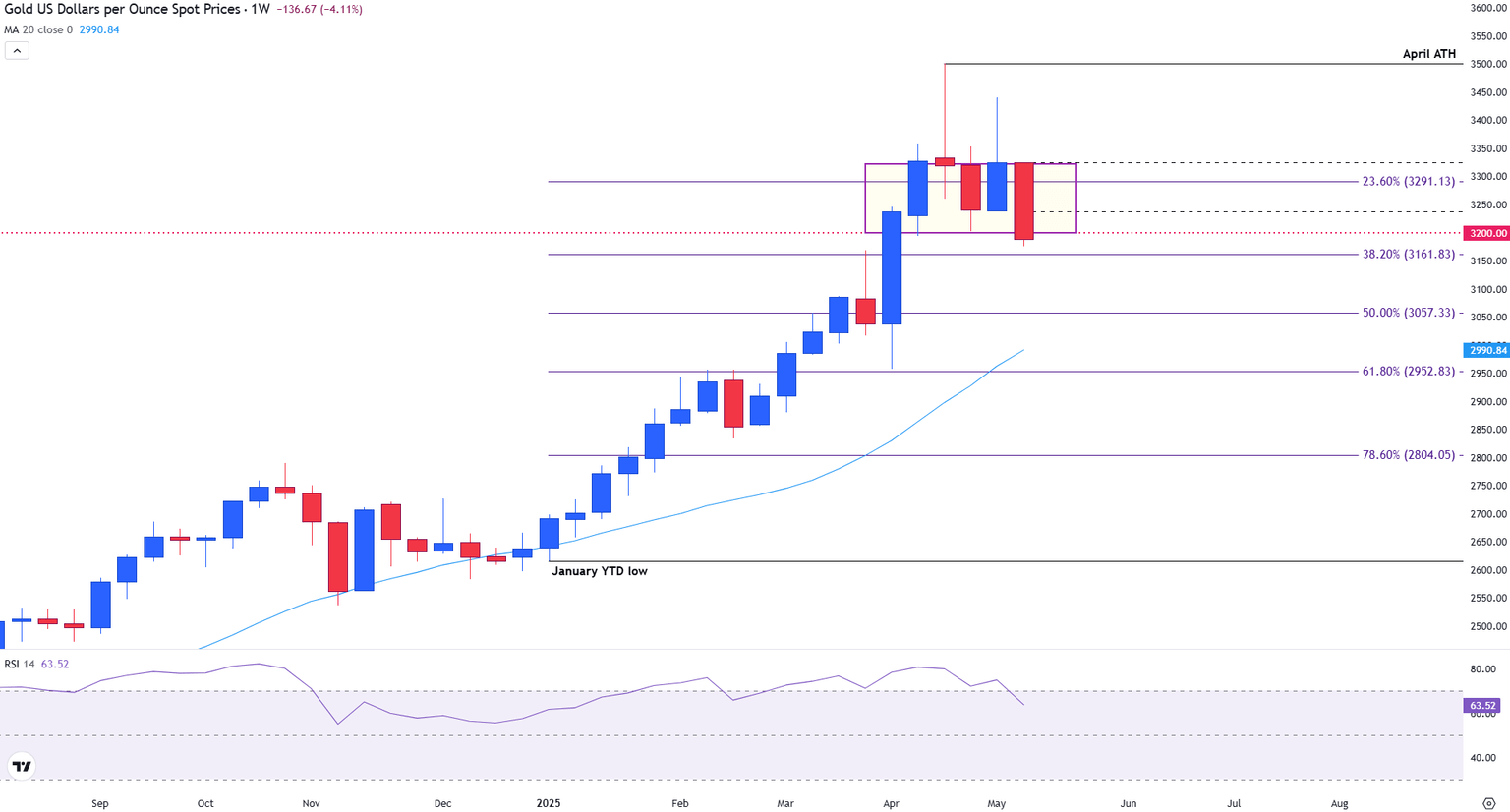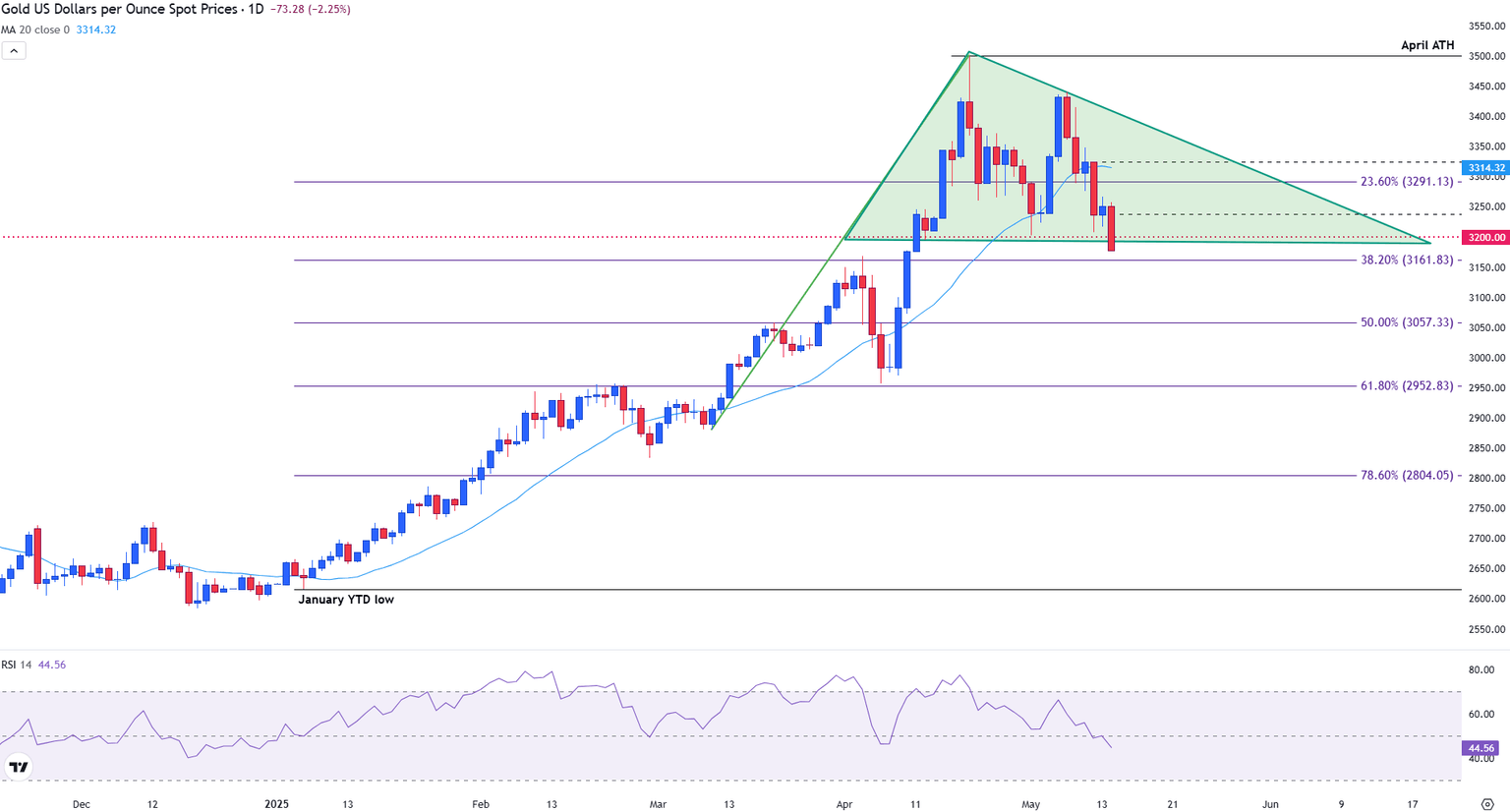 - El Oro cotiza por debajo del soporte clave de 3.200$ a medida que la presión bajista aumenta tras los máximos recientes.