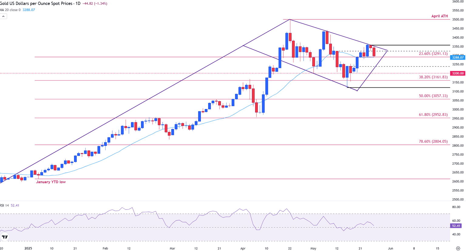 Actualmente, el Oro está cotizando justo por debajo del nivel de retroceso de Fibonacci del 23.6% (Fib) de la recuperación de enero-abril en 3.291$ y ligeramente por debajo de la media móvil simple (SMA) de 20 días, que actualmente se sitúa alrededor de 3.288$.