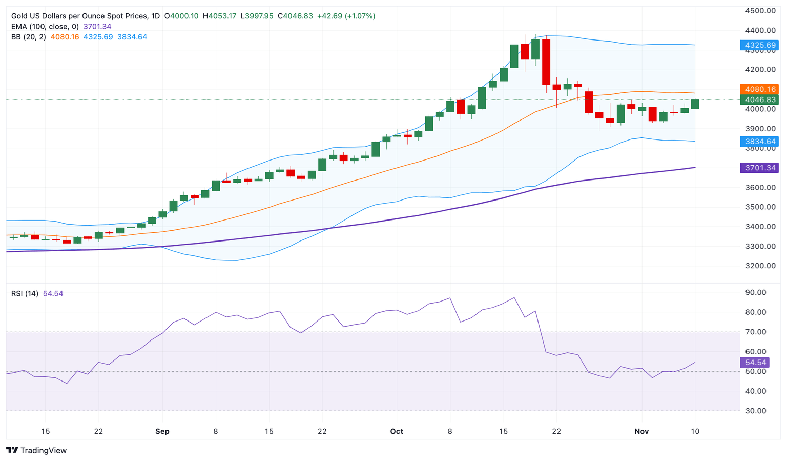 Si comenzamos a ver velas bajistas y un comercio consistente por debajo de 4.000$, eso podría señalar que los vendedores han recuperado el control. En ese caso, el XAU/USD podría regresar al límite inferior de la Banda de Bollinger de 3.835$, seguido por la EMA de 100 días de 3.705$.