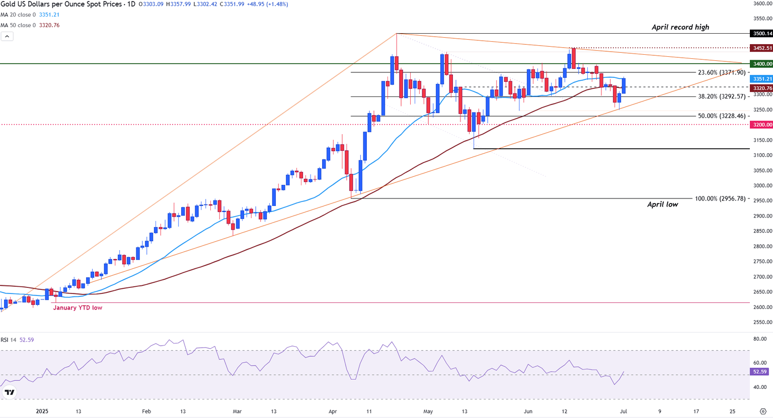 Análisis técnico del Oro: El XAU/USD rebota en el soporte de la línea de tendencia, abriendo el potencial para una nueva prueba de $3,400