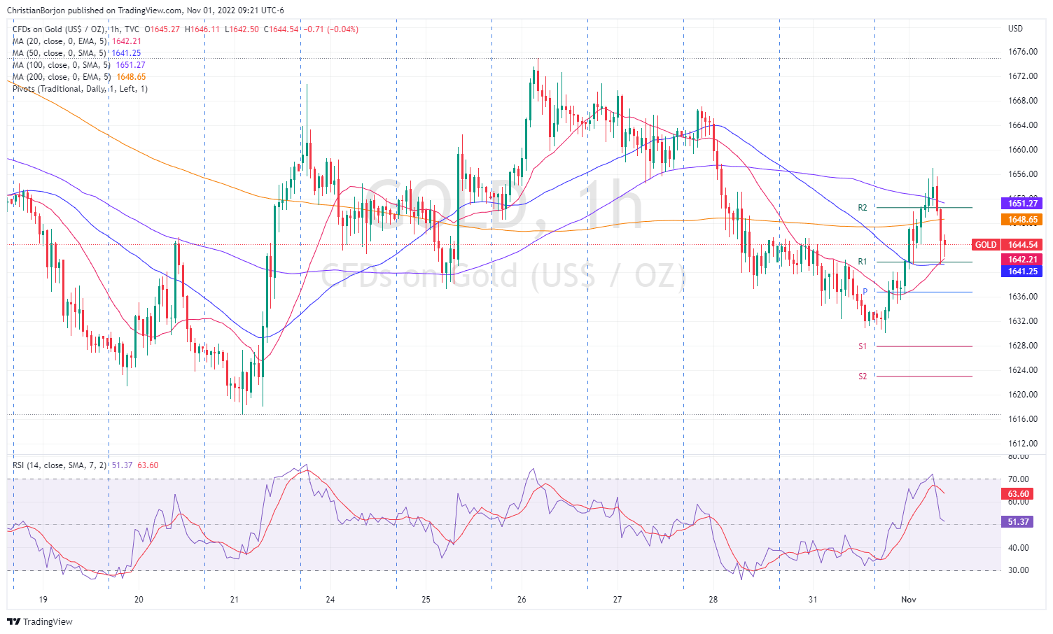 El XAU/USD tiene un sesgo neutro a la baja a corto plazo, como muestra el gráfico de una hora, con los precios deslizándose a lo largo de la sesión por debajo de las EMA de 100 y 200, que serían vallas difíciles de superar, en torno a la zona de 1.648/51$. Sin embargo, si los compradores tienen la fuerza necesaria para superar esta última zona, es posible que vuelvan a probar los máximos diarios en torno a los 1.656$, antes de los 1.674,94 $ de la semana pasada. Por otro lado, si el XAU/USD rompe por debajo del pivote diario R1, expondrá el pivote central en 1.636$, seguido del pivote diario S1 en 1.628$, antes del nivel del pivote S2 en 1.623$.