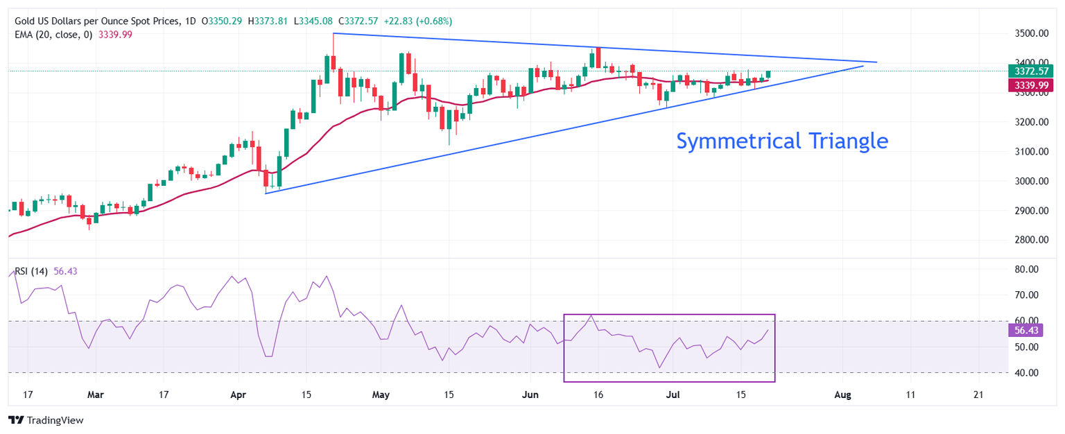 El precio del Oro cotiza en una formación de Triángulo Simétrico en un marco temporal diario, lo que indica una contracción de la volatilidad. La línea de tendencia ascendente del patrón de gráfico mencionado anteriormente se coloca desde el mínimo del 15 de mayo de 3.120,83$, mientras que su borde descendente se traza desde el máximo del 22 de abril alrededor de 3.500$.