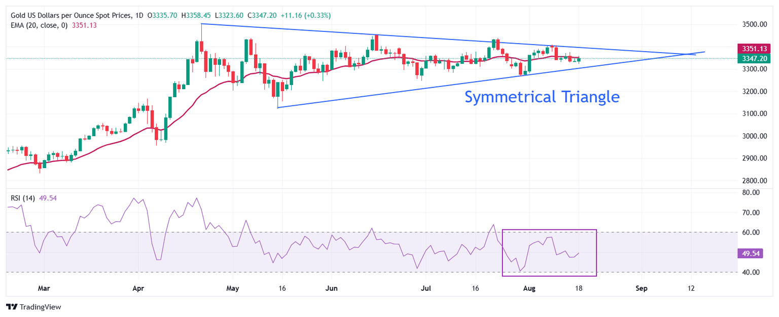 El metal amarillo oscila cerca de la Media Móvil Exponencial (EMA) de 20 días alrededor de 3.351,00$, indicando una tendencia lateral.