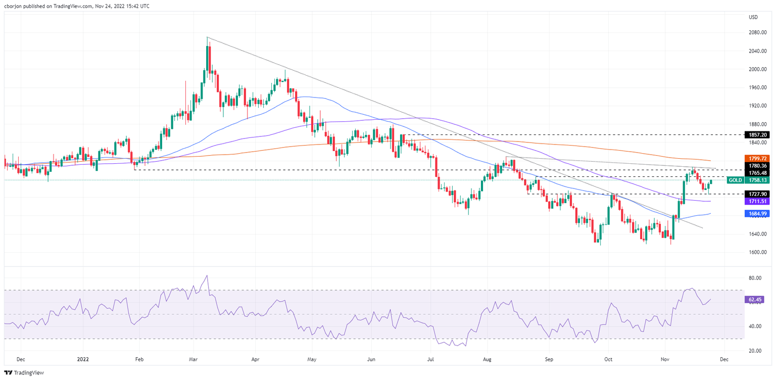 El precio del oro avanzó de manera constante el jueves en medio de condiciones de liquidez escasas, debido a la celebración de la fiesta de Acción de Gracias en los Estados Unidos, con Wall Street y el mercado de bonos cerrados. Factores como el hecho de que los responsables de la Reserva Federal (Fed) hayan acordado moderar las subidas de los tipos de interés y un ambiente de riesgo mantienen al dólar a la defensiva. Por lo tanto, el XAU/USD cotiza a 1.756$ la onza troy en el momento de redactar este informe.