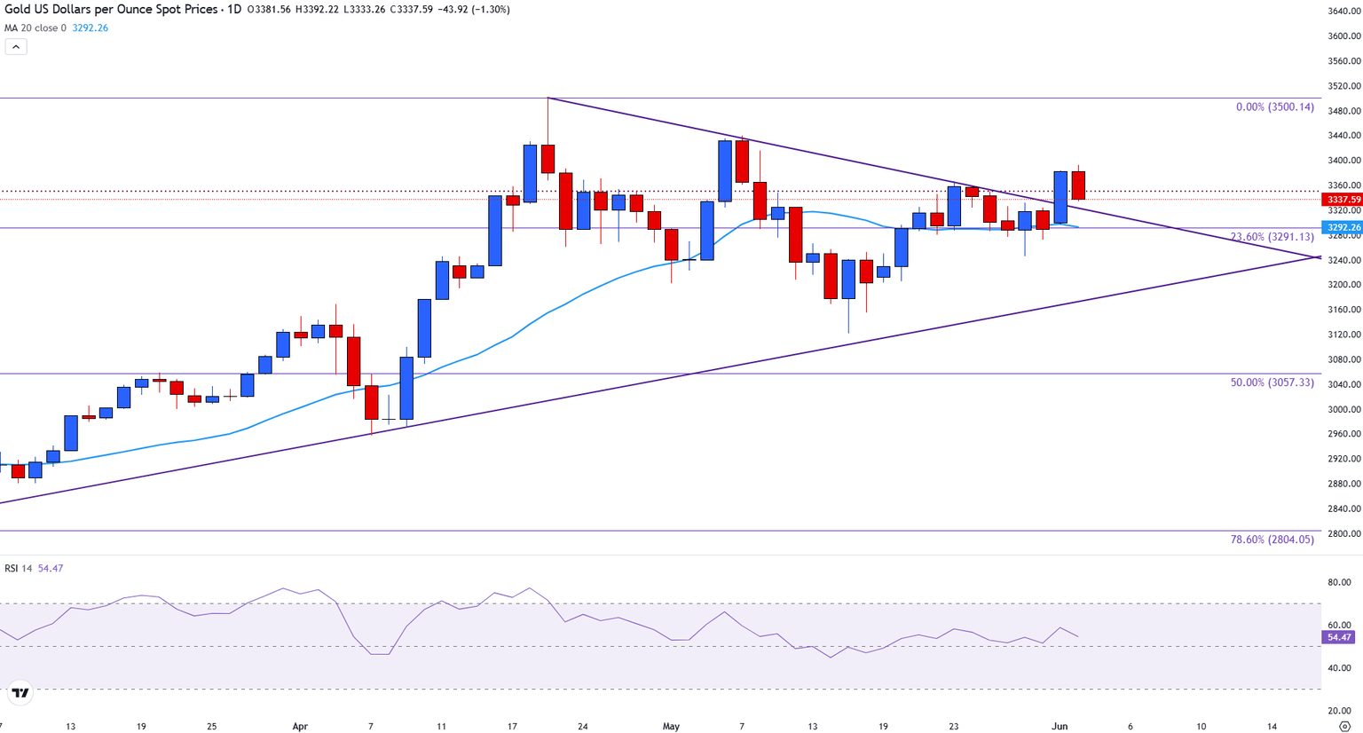 A la baja, el límite superior del triángulo se alinea con la media móvil simple (SMA) de 10 días en 3,324$, con el nivel psicológico de 3,300$ justo por debajo. A 3,293$, la SMA de 20 días está proporcionando una capa adicional de soporte, cuya ruptura podría llevar al nivel de retroceso de Fibonacci del 23.6% del movimiento de enero-abril cerca de 3,291$.