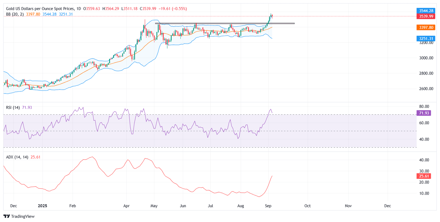 El Oro (XAU/USD) se toma una pausa el jueves tras alcanzar un nuevo máximo histórico de 3.578,50$ el miércoles, deteniendo un notable repunte de siete días. Al momento de escribir, el XAU/USD se cotiza alrededor de 3.545$ durante la sesión americana, después de haber caído hacia 3.510$ más temprano en el día, ya que la toma de beneficios y un Dólar estadounidense (USD) estable pesan sobre el sentimiento. Este movimiento también se produce a medida que regresa la calma a los mercados de bonos globales tras la agitación de esta semana, aliviando parte de la prisa por refugios seguros que había alimentado la carrera récord del oro.