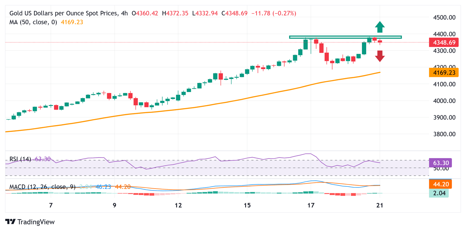 El Oro (XAU/USD) extiende su retroceso intradía desde las cercanías del máximo histórico y cae por debajo del nivel de 4.320$ al entrar en la sesión europea del martes, aunque carece de ventas de continuación. El Dólar estadounidense (USD) atrae compradores por tercer día consecutivo y resulta ser un factor clave que ejerce presión a la baja sobre la materia prima. Además, un tono generalmente positivo en torno a los mercados de renta variable contribuye a desviar flujos del metal precioso refugio seguro.
