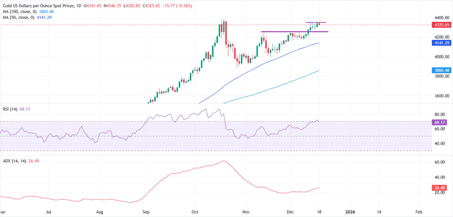 - Técnicamente, el XAU/USD continúa consolidándose por debajo de los 4.350$, con un fuerte soporte cerca de los 4.250$ que ayuda a preservar la estructura alcista.
