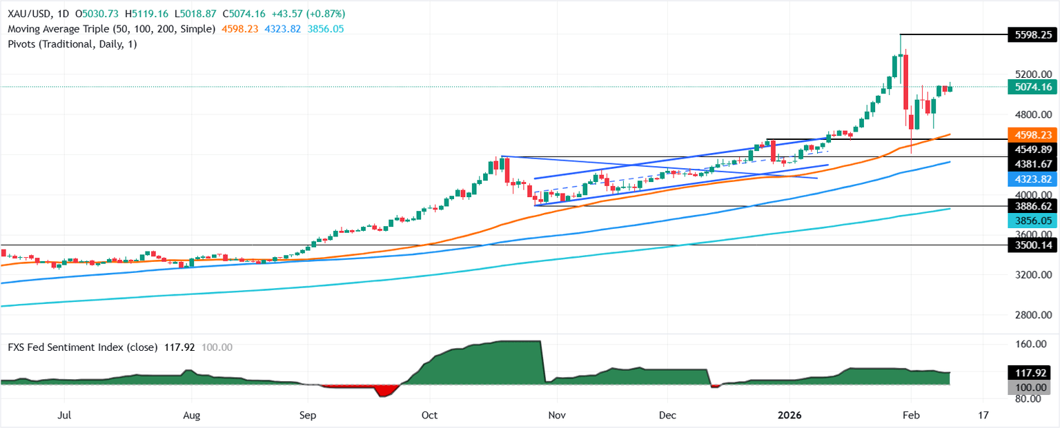La acción del precio del Oro muestra que la tendencia alcista se mantiene intacta, y mientras el metal amarillo permanezca por encima de la media móvil simple (SMA) de 20 días en 4.935$, la tendencia sigue siendo constructiva con los compradores mirando precios más altos. Si recuperan la marca de 5.100$, esto podría exacerbar un repunte hacia 5.451$, el máximo del 30 de enero. Con más fuerza, el desafío del máximo histórico de 5.598$ está en juego.