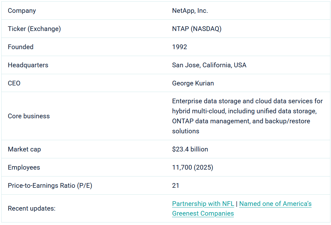 NetApp (NASDAQ: NTAP) es una empresa de infraestructura de datos que opera en el sector empresarial, ofreciendo una gama de servicios, incluyendo almacenamiento de datos, gestión de datos y soluciones en la nube.