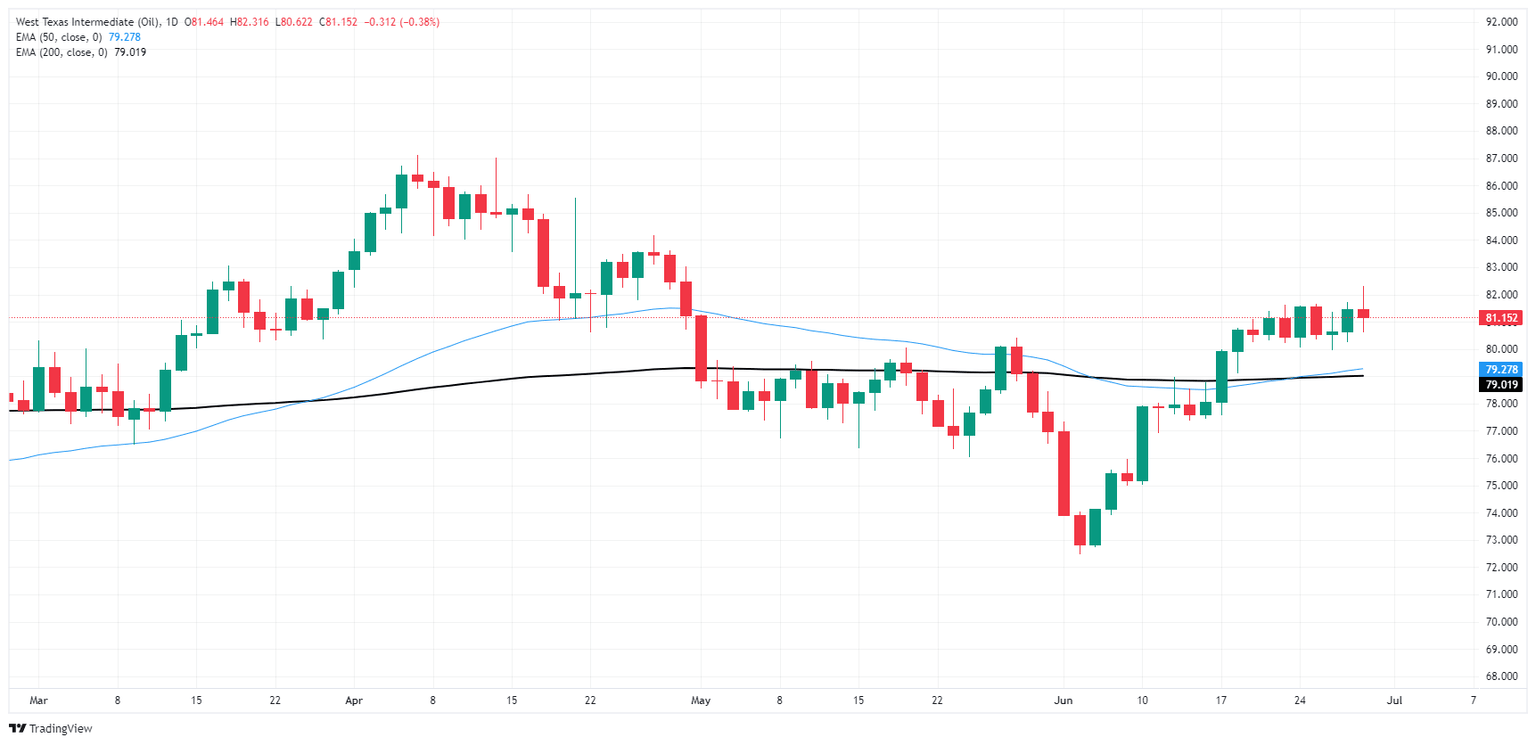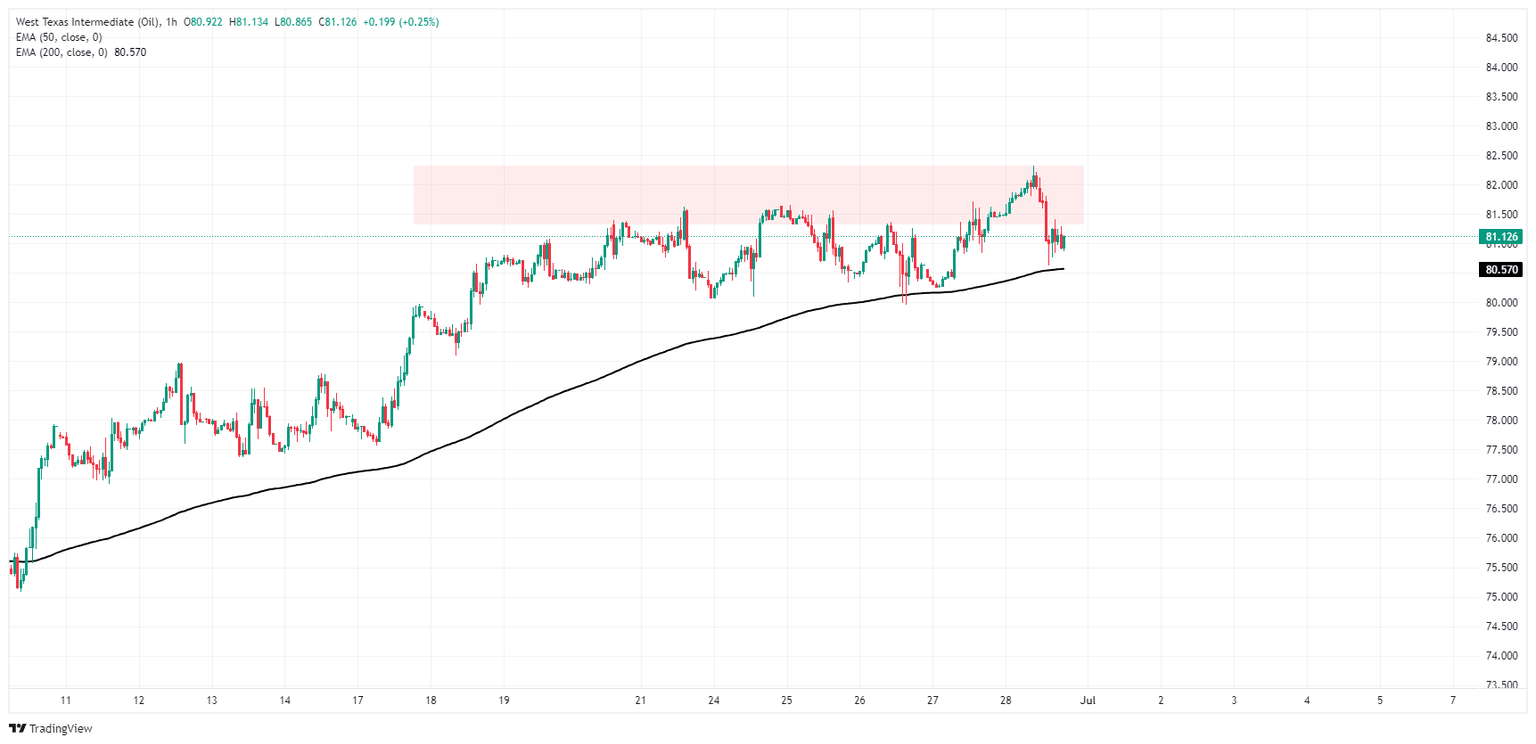 El petróleo crudo WTI de EE.UU. alcanzó un nuevo máximo de ocho semanas de 82.31$ el viernes antes de retroceder a territorio de gráfico bajista para la última sesión de la semana de negociación, cerrando la semana luchando con la zona de 81.00$. La agitación del gráfico a corto plazo tiene al WTI bajo una firme presión bajista desde una zona de oferta por encima de 81.50$ por barril.