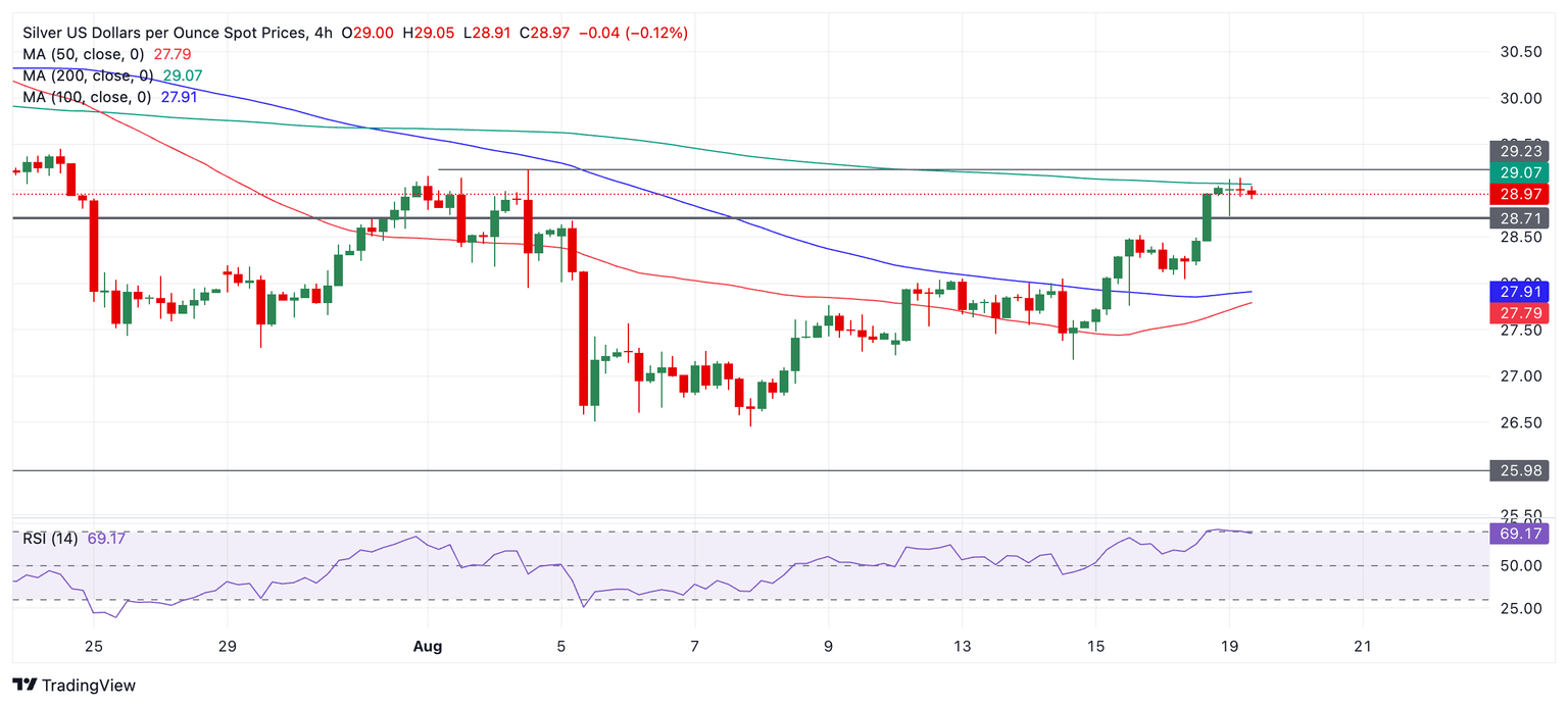El metal precioso está ahora cerca del máximo del 2 de agosto en 29.23$, donde encontrará más resistencia técnica, sin embargo, dado el sesgo alcista a corto plazo, probablemente superará la resistencia eventualmente y continuará al alza.