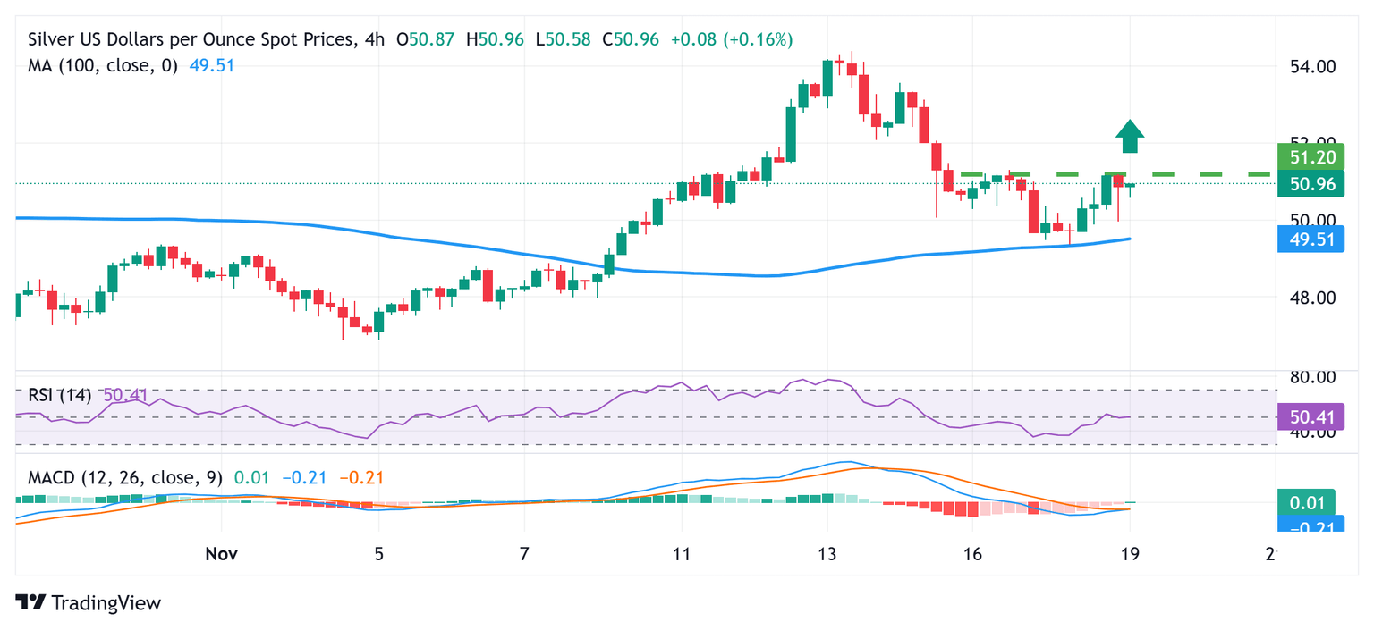 La Plata (XAG/USD) revierte una modesta caída en la sesión asiática a niveles por debajo de la marca psicológica de 50.00$ y busca construir sobre el rebote del día anterior desde un mínimo de más de una semana. El metal blanco actualmente se negocia alrededor de la región de 50.80$, casi sin cambios en el día, y podría subir más mientras se mantenga por encima de la media móvil simple (SMA) de 100 períodos en el gráfico de 4 horas.