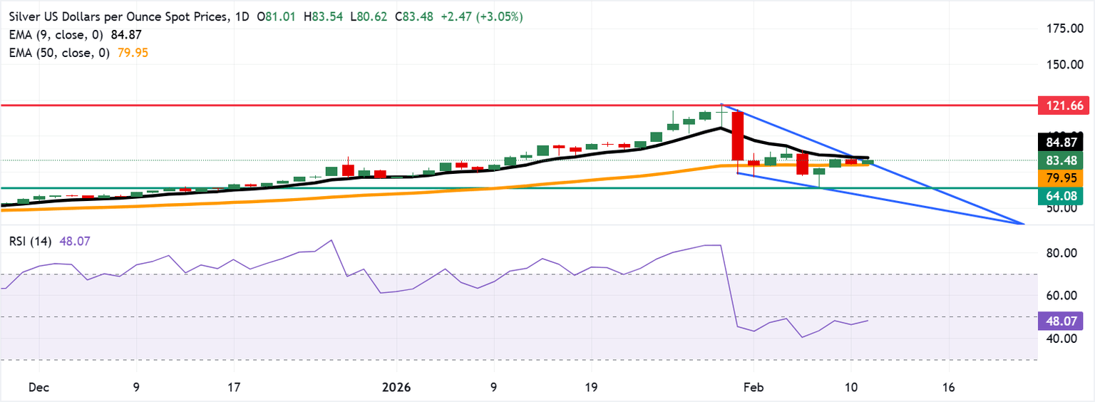 El precio de la Plata se mantiene por encima de la media móvil exponencial (EMA) de 50 días en ascenso, pero cotiza por debajo de la EMA de nueve días en descenso, manteniendo la tendencia más amplia apoyada mientras limita los rebotes inmediatos. La media a medio plazo continúa subiendo, señalando una demanda subyacente. Recuperar la EMA de nueve días mejoraría la tracción al alza hacia la resistencia en 121.66$.