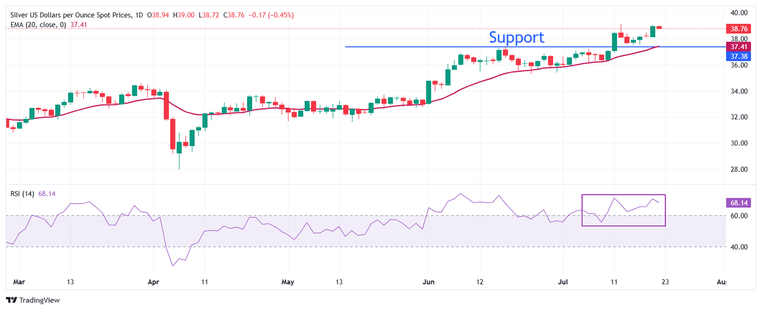 El precio de la Plata opera de manera ampliamente estable cerca de su máximo de varias décadas alrededor de los 39.00$. La media móvil exponencial (EMA) de 20 días con pendiente ascendente cerca de 37.40$ sugiere que la tendencia a corto plazo es alcista.