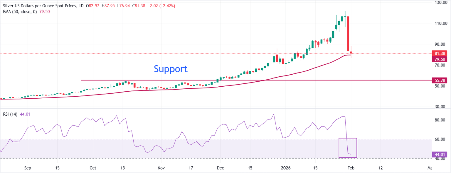 En el gráfico diario, el XAG/USD cotiza a 81.38$. El precio se mantiene por encima de la EMA de 50 días en 79.50$, manteniendo la tendencia alcista a medio plazo. La pendiente ascendente de la media apoya el sesgo más amplio. El RSI en 44 (neutral) refleja un momentum enfriado tras un período de sobrecompra. Un mantenimiento sostenido por encima de la media podría mantener a los compradores comprometidos, mientras que un cierre por debajo de ella expondría el lado negativo.