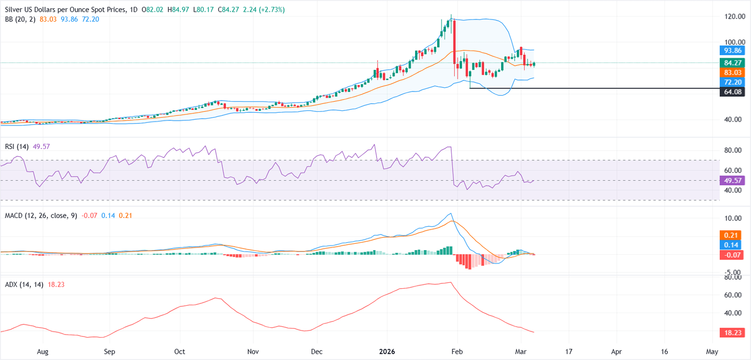 Al momento de escribir, el XAG/USD se cotiza alrededor de 84.27$, con un aumento de casi 2.73% en el día tras rebotar de un mínimo diario cerca de 80.17$.