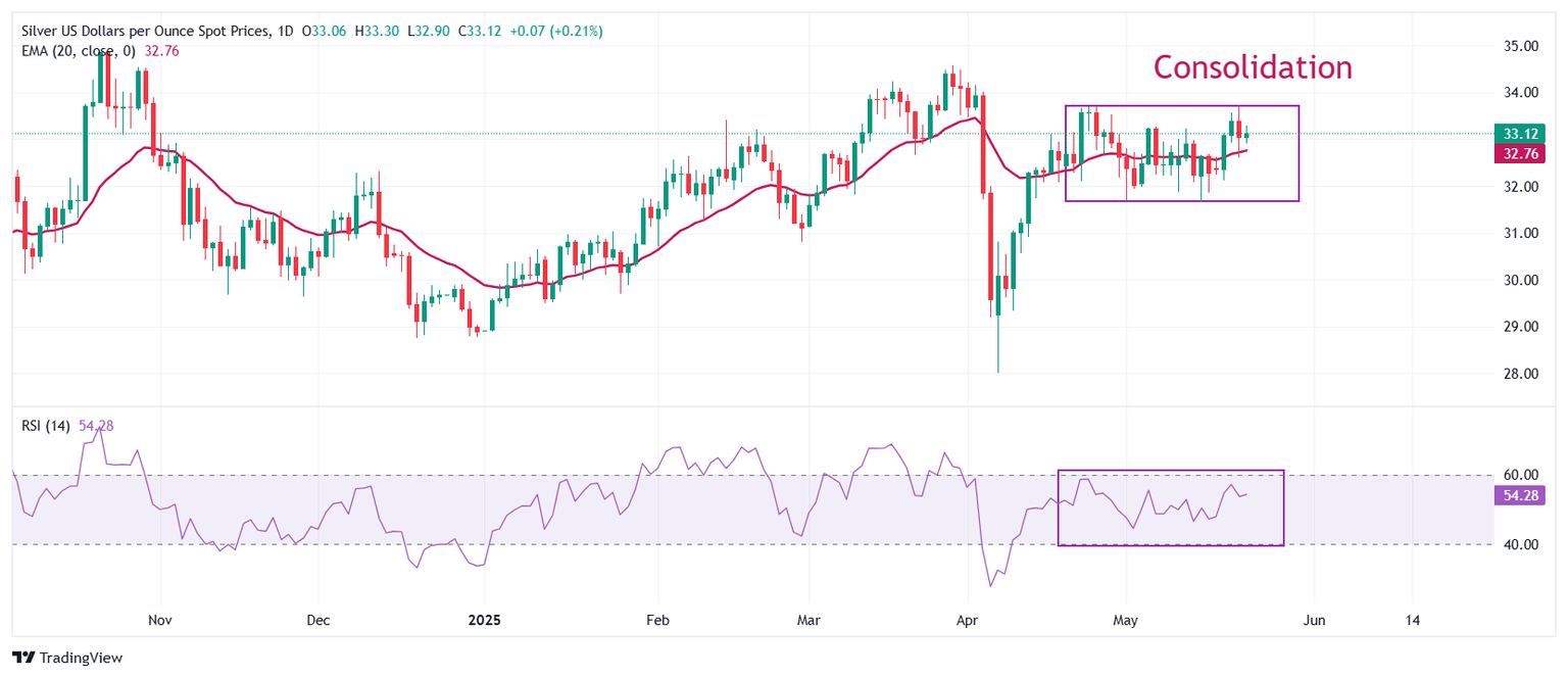 El precio de la Plata oscila dentro del rango de negociación del jueves alrededor de 33$ el viernes. El metal blanco se negocia en un rango entre 31.65$ y 33.70$ durante un mes. La tendencia a corto plazo del metal blanco es incierta ya que tambalea alrededor de la media móvil exponencial (EMA) de 20 períodos, que se negocia cerca de 32.75$.