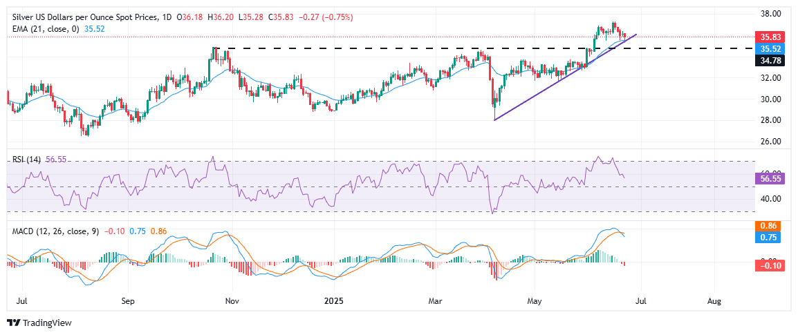 Desde una perspectiva técnica, el gráfico diario de la Plata sigue siendo constructivo pero muestra señales tempranas de fatiga. La caída del martes llevó al XAG/USD de regreso hacia su soporte de línea de tendencia ascendente, que ha guiado la tendencia alcista desde mediados de abril. Esta línea de tendencia, reforzada por la media móvil exponencial (EMA) de 21 días cerca de 35.50$–35.60$, ha actuado repetidamente como un trampolín para nuevas compras.