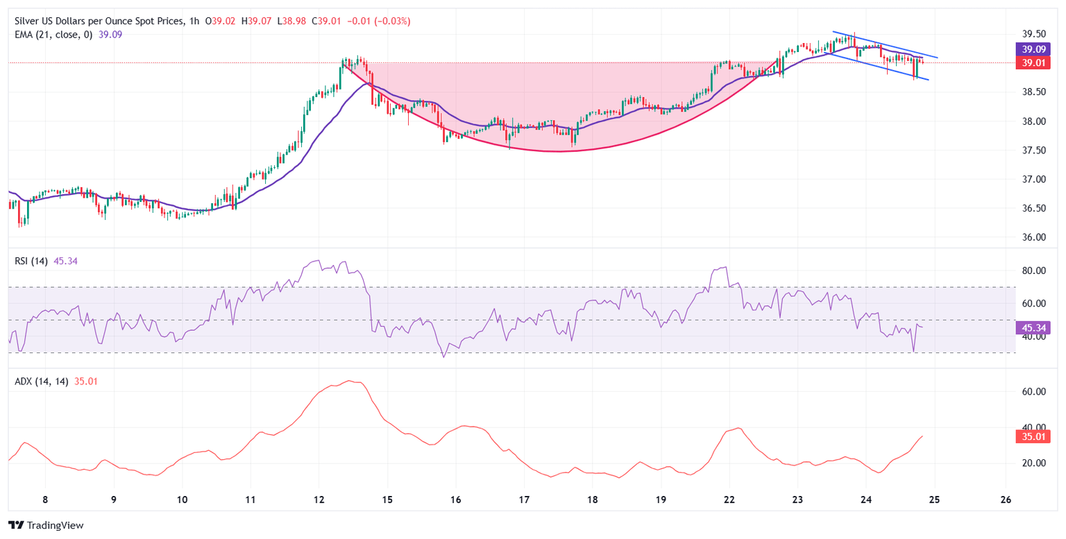 En el gráfico de 1 hora, la Plata recientemente rompió un clásico patrón de taza con asa, con el asa formándose como un cuña descendente — un patrón de continuación alcista. Sin embargo, la ruptura se ha estancado cerca de la marca de 39.50$, ya que los compradores luchan por mantener el impulso. En el momento de escribir, el metal se cotiza justo por debajo de la EMA de 21 períodos, que se ha aplanado alrededor de 39.09$ y actualmente actúa como resistencia inmediata, limitando el potencial alcista intradía.