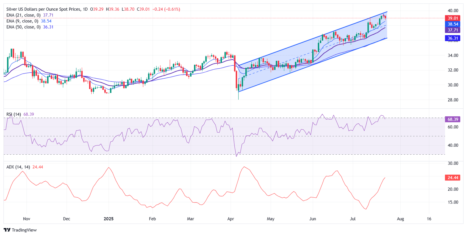 La Plata (XAG/USD) retrocede el jueves después de marcar un nuevo máximo de 14 años de 39.53$ el miércoles, ya que la mejora en el sentimiento comercial global impulsó el apetito por el riesgo y afectó la demanda de activos refugio tradicionales como los metales preciosos. En el momento de escribir, el metal se encuentra alrededor de 39.00$, con una caída de casi el 0.50% en el día. La corrección se produce en medio de una estabilización generalizada del Dólar estadounidense (USD) y un repunte de las acciones globales impulsado por el optimismo en torno a un posible acuerdo arancelario entre EE.UU. y la UE.