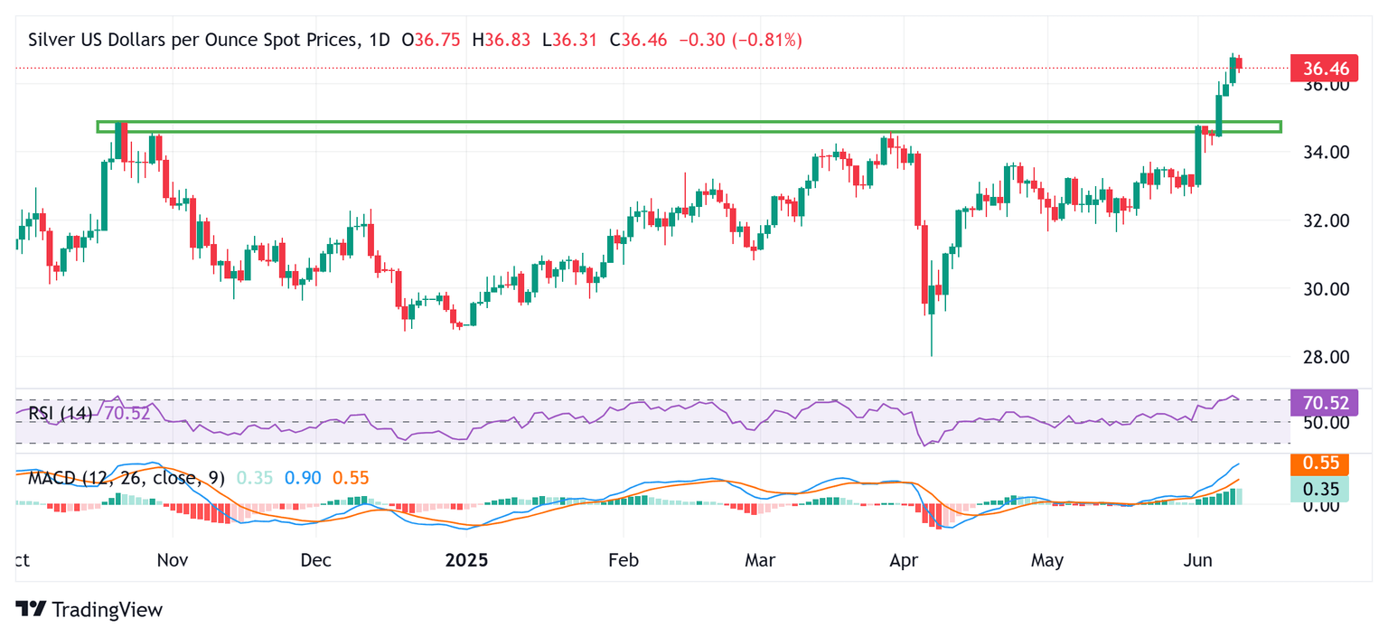 Plata Análisis del Precio: XAG/USD retrocede desde el máximo de varias semanas, se desliza por debajo de 36.50$