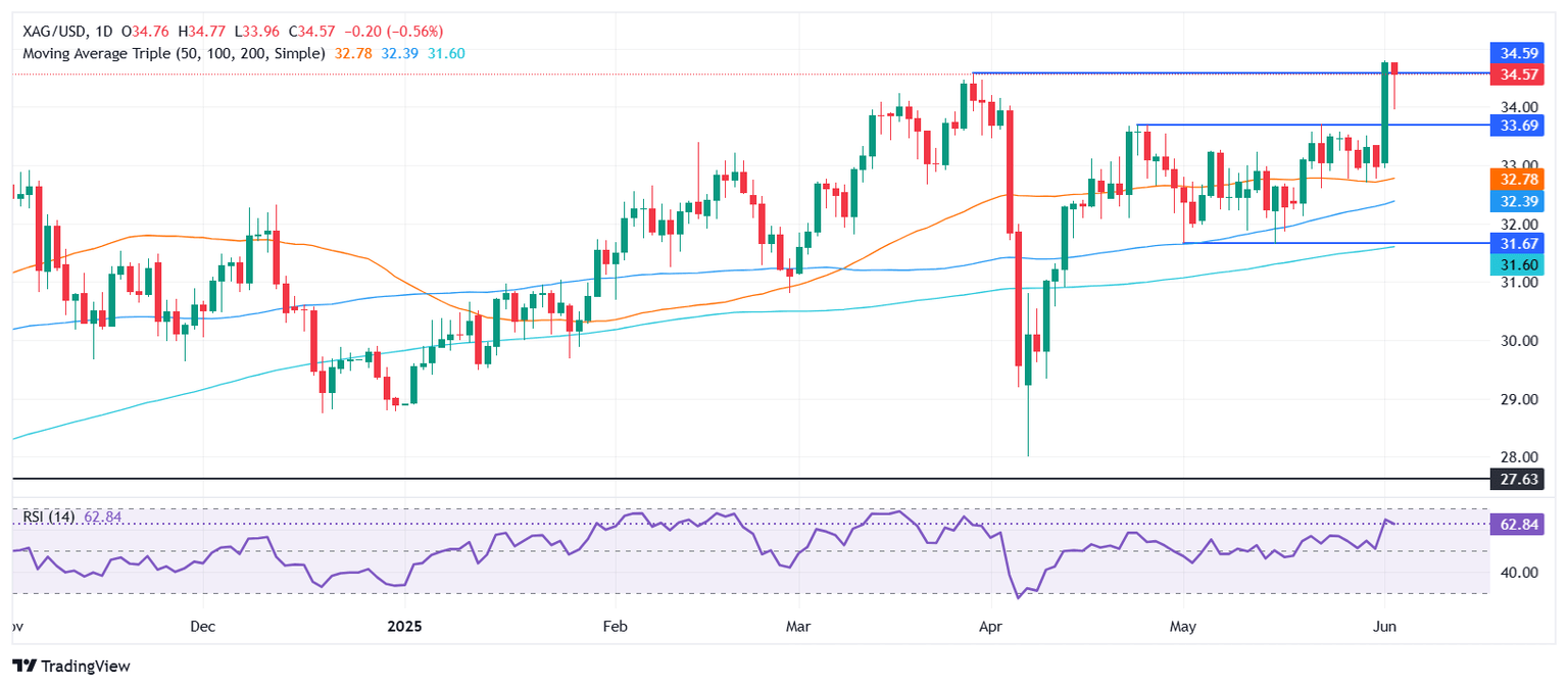 Análisis de la Plata: El XAG/USD retrocede desde máximos anuales pero se mantiene por encima de 34.50$