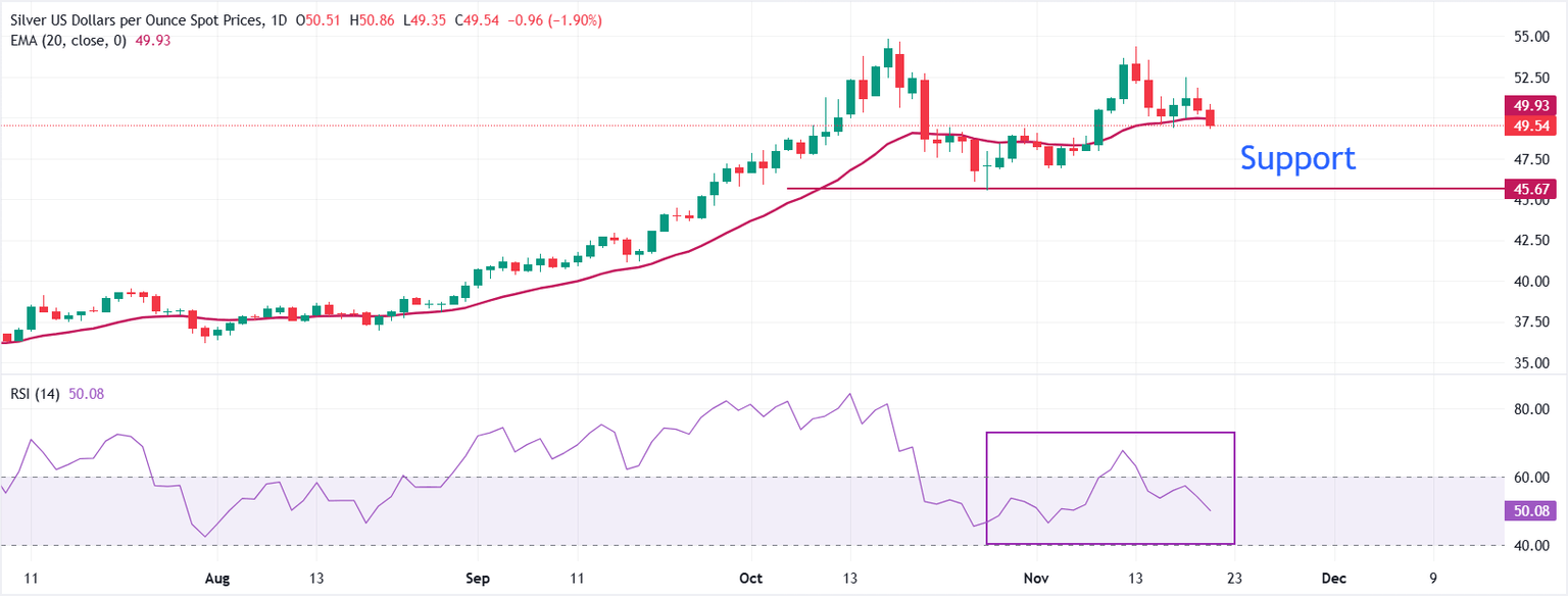 El precio de la Plata lucha por mantener la Media Móvil Exponencial (EMA) de 20 días, que cotiza alrededor de 49.50$.