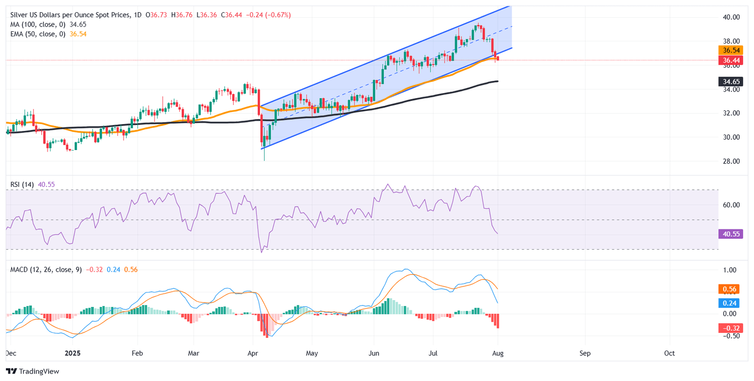La Plata (XAG/USD) continúa luchando bajo el peso de un Dólar estadounidense más fuerte, extendiendo su declive desde el máximo de 14 años de 39.53$ alcanzado el 23 de julio. En el momento de escribir, el metal blanco se cotiza cerca de 36.50$ durante la sesión de comercio estadounidense, bajando casi un 4.5% hasta ahora esta semana, con los operadores volviéndose cautelosos antes del informe clave de Nóminas no Agrícolas (NFP) de EE.UU. del viernes a las 12:30 GMT.