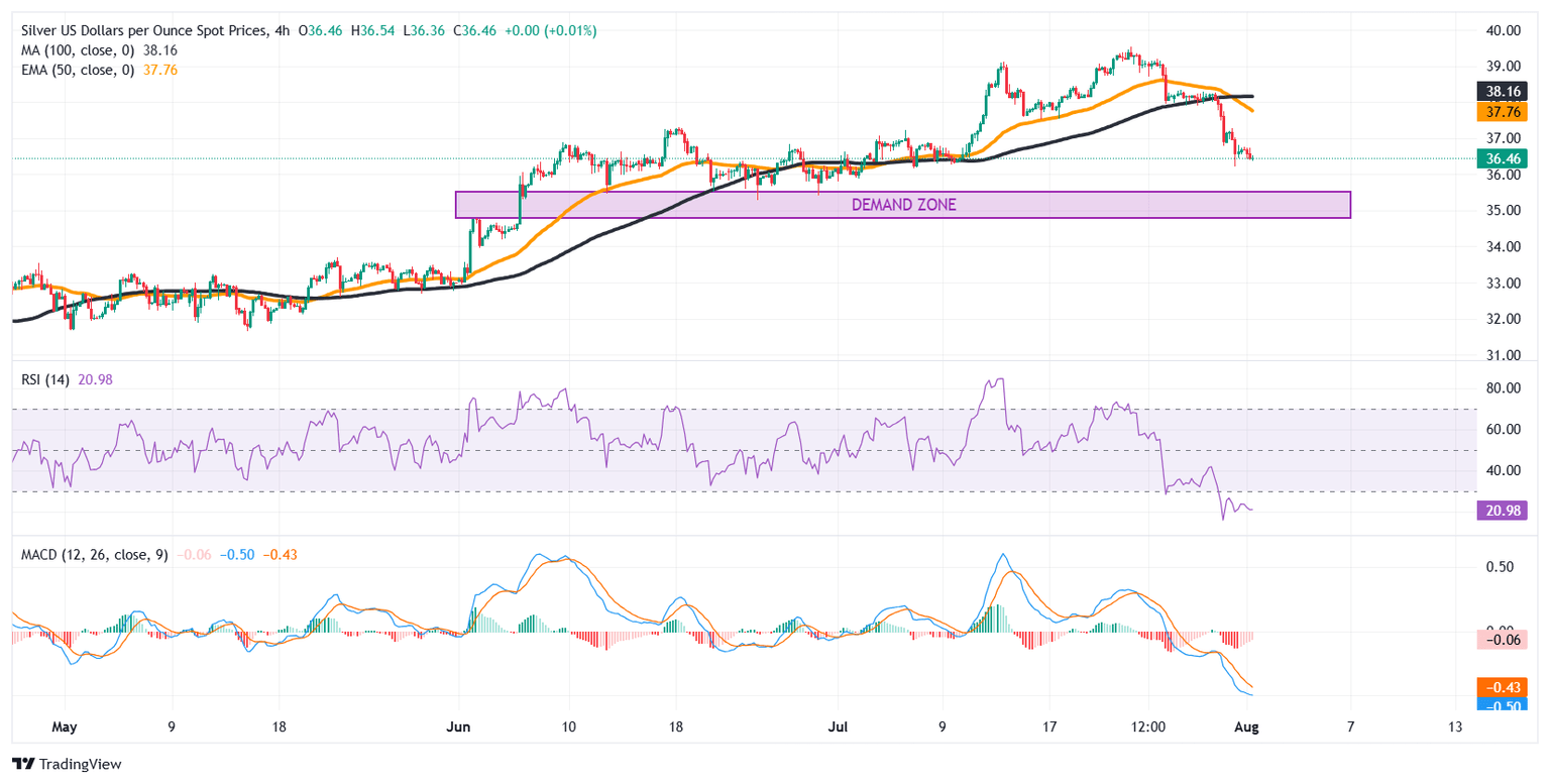 Al acercarse al marco temporal de 4 horas, la Plata ha roto por debajo de la EMA de 50 y la SMA de 100, subrayando la persistente presión de venta a corto plazo. El precio se está acercando ahora a una zona de demanda clave en el rango de 35.30$ a 35.70$, que podría ofrecer algo de soporte a corto plazo. Sin embargo, con el RSI de 4 horas cayendo a niveles de sobreventa cerca de 21, un rebote a corto plazo es posible. Aún así, el MACD permanece profundamente en territorio negativo, sugiriendo que la tendencia general sigue inclinada a la baja, a menos que un informe de NFP más suave de lo esperado desencadene una reversión.