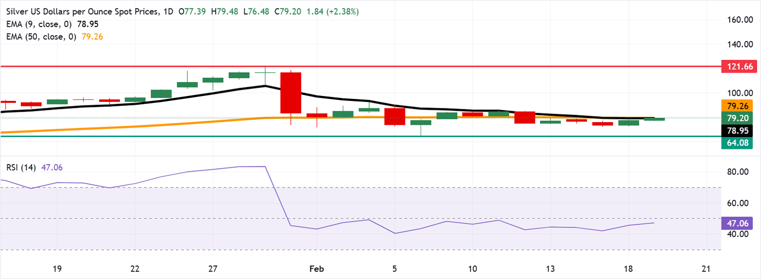 El precio de la Plata (XAG/USD) extiende sus ganancias por segunda sesión consecutiva, cotizando alrededor de 79.20$ por onza troy durante las horas europeas del jueves. El análisis técnico del marco de tiempo del gráfico diario muestra que el Índice de Fuerza Relativa (RSI) de 14 días en 47 (neutral) está subiendo, indicando que el momentum se está estabilizando.