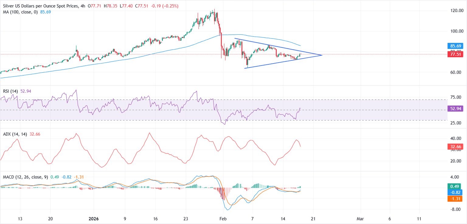 Desde una perspectiva técnica, el gráfico de 4 horas está comenzando a volverse constructivo. El XAG/USD está formando un patrón de triángulo, con la acción del precio comprimiéndose y la volatilidad disminuyendo, aumentando el riesgo de una ruptura en cualquier dirección.