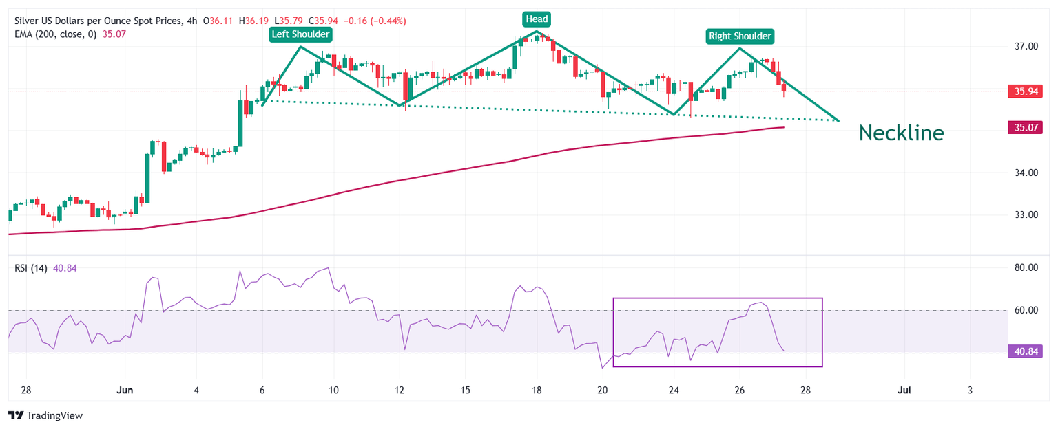 El precio de la Plata forma un patrón gráfico de Cabeza y Hombros (H&S) en un marco temporal de cuatro horas cuyo quiebre por debajo de la línea de cuello resulta en una reversión bajista. La línea de cuello del patrón gráfico se traza cerca del mínimo del martes alrededor de 35.28$.
