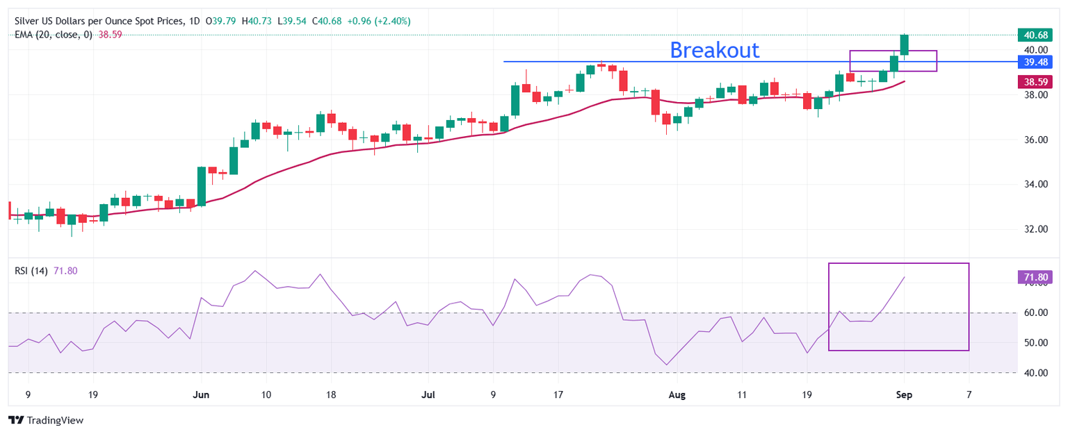 El precio de la Plata salta a cerca de 40.70$ tras una ruptura por encima del máximo anterior de 39.53$ registrado el 23 de julio. La tendencia a corto plazo del precio de la Plata es alcista ya que la media móvil exponencial (EMA) de 20 días se inclina al alza alrededor de 38.60$.