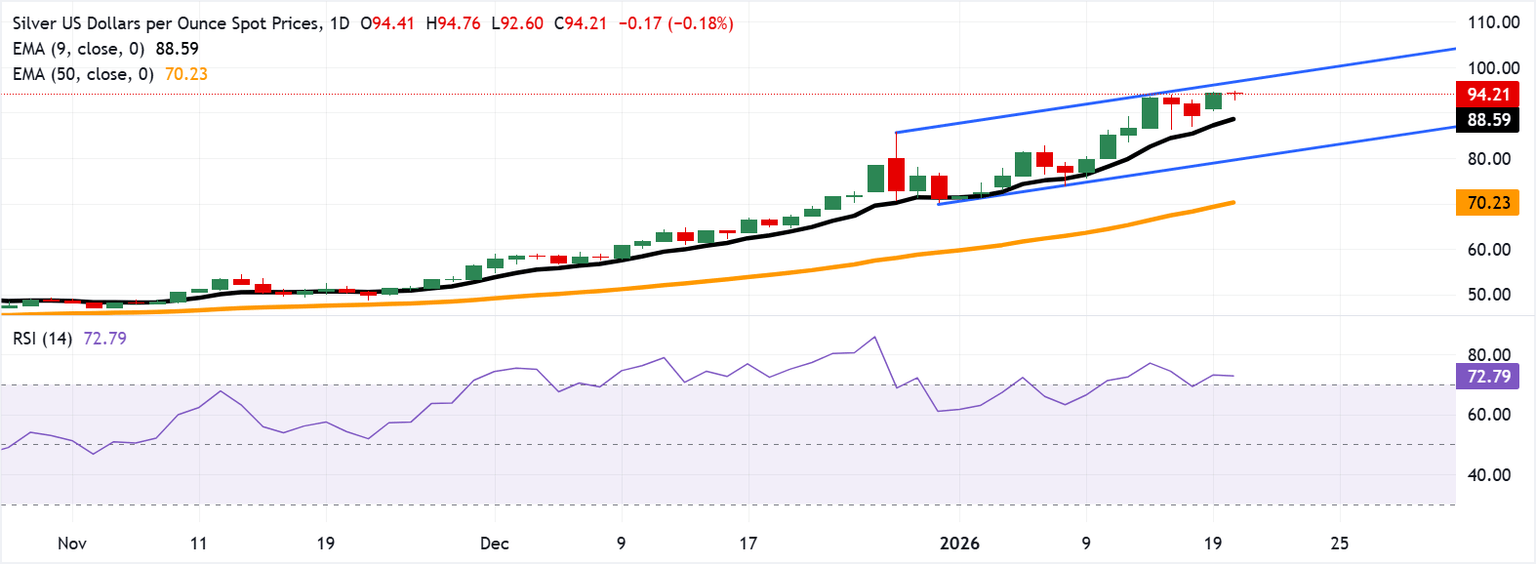 El precio de la Plata (XAG/USD) retrocede ligeramente después de alcanzar un nuevo récord de 94.76$, cotizando actualmente alrededor de 94.20$ por onza troy durante las horas europeas del martes. El análisis técnico del gráfico diario muestra que el metal precioso se cotiza más alto dentro de un canal ascendente, señalando un sesgo alcista sostenido.