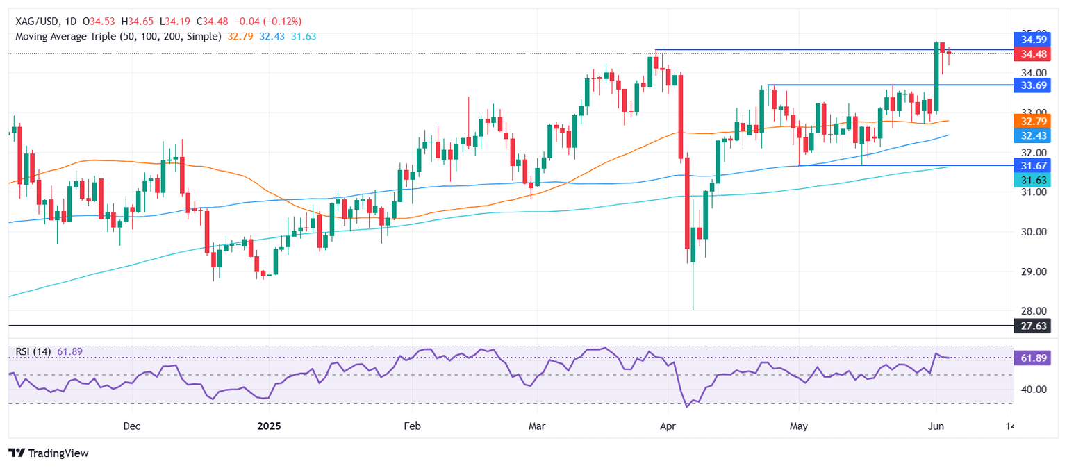 Técnicamente, la Plata sigue teniendo un sesgo alcista, aunque los compradores están tomando un respiro tras la ganancia de más del 5% del lunes, que empujó al XAG/USD de alrededor de 33.00$ a 34.50$, la ganancia más significativa desde el 18 de octubre de 2024, cuando la Plata ganó un 6.40%.