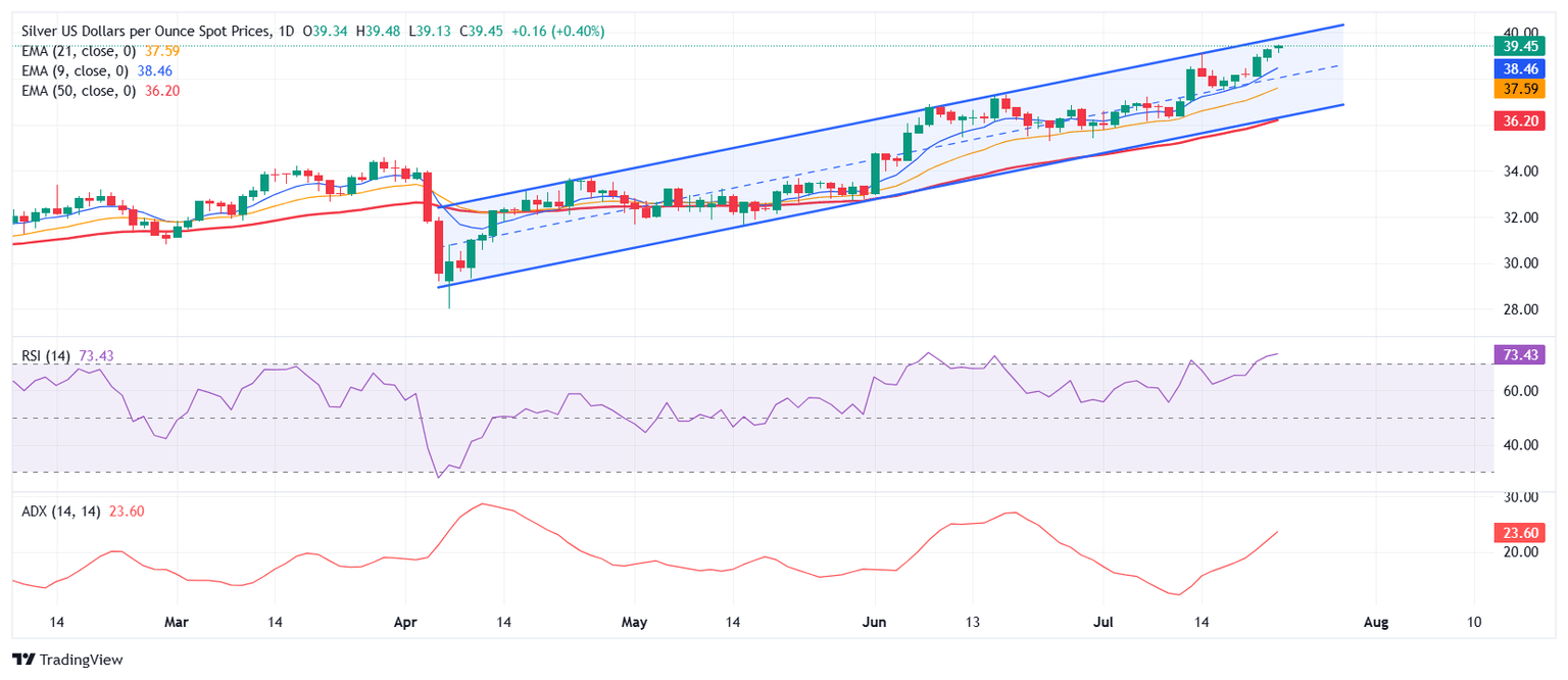 La Plata (XAG/USD) está en un punto muerto el miércoles tras un fuerte avance de dos días que marcó nuevos máximos de varios años. El metal se está consolidando justo por debajo de la clave marca de 39.50$ durante las horas de negociación estadounidenses. Mientras que el impulso alcista se mantiene intacto, la pausa se produce a medida que el Dólar estadounidense (USD) se estabiliza tras un acuerdo comercial entre Estados Unidos y Japón, lo que ha inyectado una dosis de optimismo cauteloso en los mercados más amplios y ha inclinado el sentimiento hacia el riesgo.