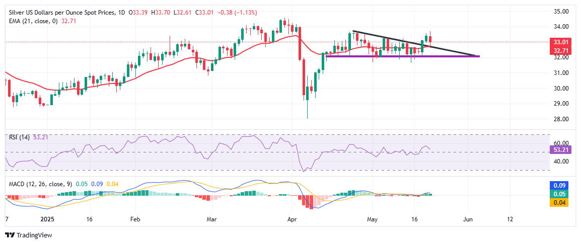 La Plata (XAG/USD) revierte bruscamente a la baja el jueves después de probar brevemente los 33.70$, su nivel más alto en siete semanas, mostrando signos de fatiga a corto plazo tras un fuerte breakout alcista el miércoles, cotizando alrededor de 32.95$ durante la sesión americana. El retroceso fue impulsado por un leve repunte en el Dólar estadounidense y un rechazo técnico por debajo del nivel psicológico de 34.00$ cerca del máximo de abril.