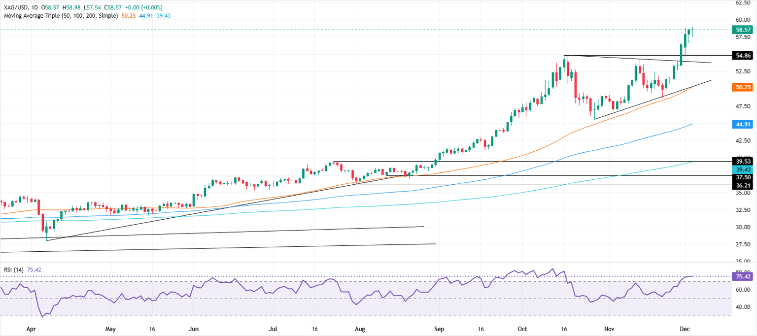 La tendencia alcista del precio de la Plata se mantiene intacta, a pesar de que el metal gris cayó hacia un mínimo diario de 57.54$, antes de recuperar la cifra de 58.00$. El impulso alcista se mantiene, pero una "leve divergencia" entre la acción del precio y el Índice de Fuerza Relativa (RSI) podría allanar el camino para un retroceso.