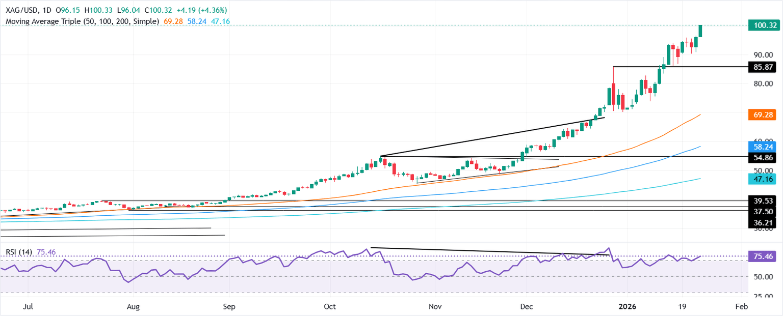 Los precios de la Plata (XAG/USD) alcanzaron el hito de 100.00$ el viernes, registrando un máximo histórico de 100.39$ antes de retroceder hacia la cifra de tres dígitos. El metal gris está registrando ganancias diarias de más del 4% después de rebotar desde mínimos diarios de 96.04$.