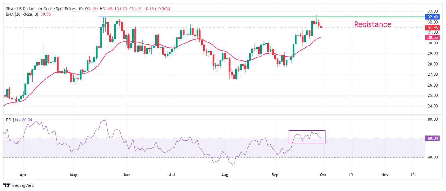 Plata Análisis del Precio: XAG/USD cae cerca de 31,50$ antes del discurso de Powell