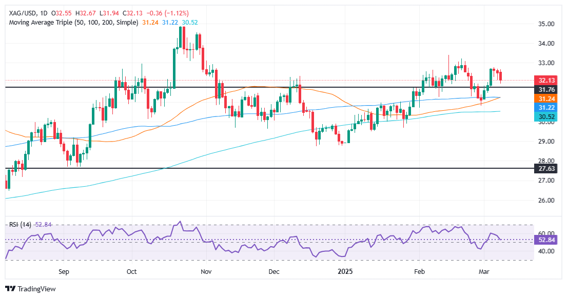 El precio de la plata ha caído por debajo del mínimo del pasado viernes de 32.11$, con los vendedores apuntando a la zona de 31.00$. Si el XAG/USD cierra a diario por debajo de 32.00$, busque una prueba de un fuerte soporte en la confluencia de las medias móviles simples (SMA) de 100 y 50 días en 31.22$. Una ruptura de este último expondrá 31.00$ la onza troy y despejará el camino para desafiar la SMA de 200 días en 30.50$.