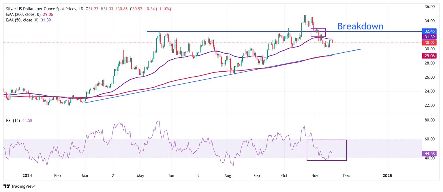 El precio de la Plata se mantiene en camino hacia la línea de tendencia ascendente alrededor de 29.00$, trazada desde el mínimo de febrero de 22.30$, que también coincide con la media móvil exponencial (EMA) de 200 días. El metal blanco retrocede después de enfrentar presión vendedora cerca de la EMA de 50 días, que se negocia alrededor de 31.40$.