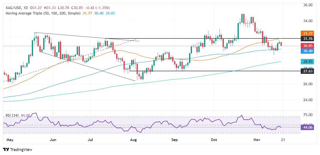 El metal sin rendimiento cotiza dentro del rango de 30.38$-31.75$, protegido por las medias móviles simples (SMA) de 100 y 50 días, respectivamente. A pesar de estar dentro de un rango, el XAG/USD tiene un sesgo bajista a corto plazo, ya que el metal precioso logra una serie sucesiva de máximos y mínimos más bajos.