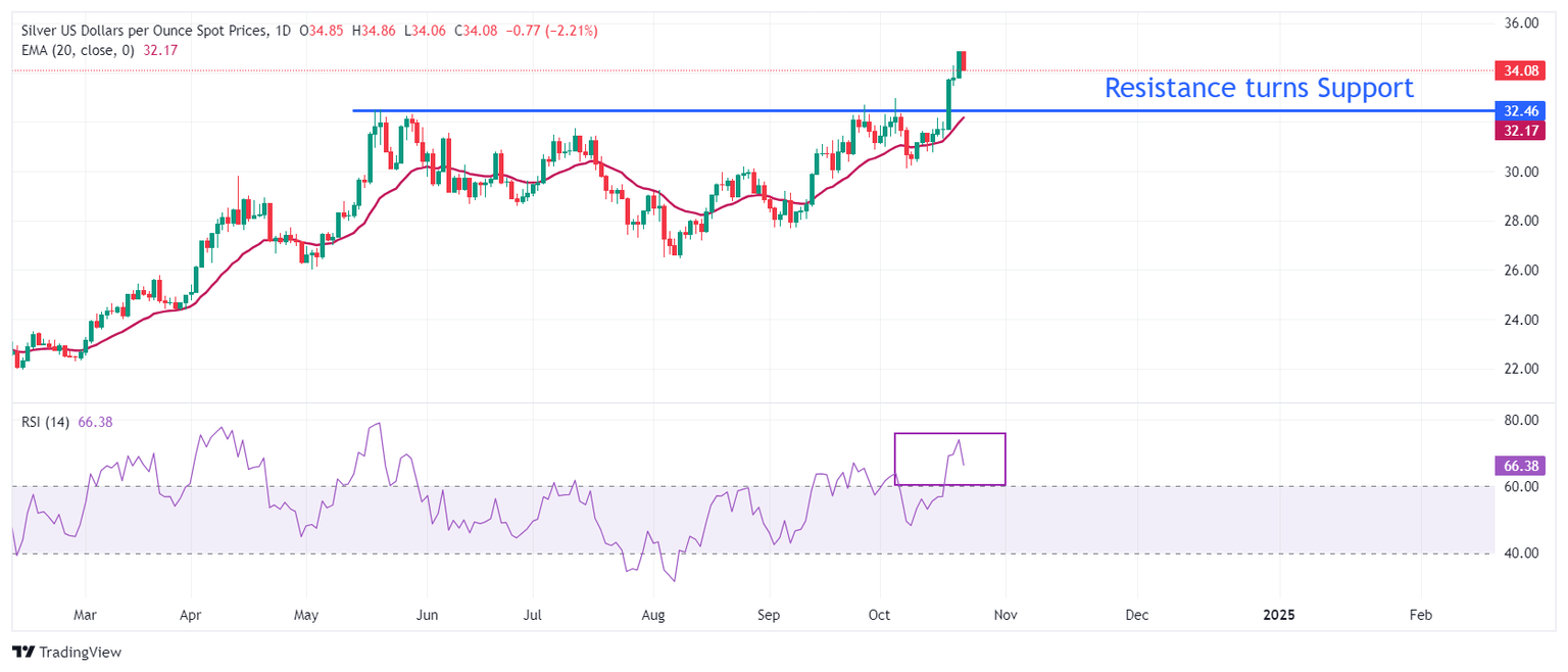 Plata Análisis del Precio: El XAG/USD corrige por debajo de 34.50$ mientras los rendimientos de EE.UU. se disparan