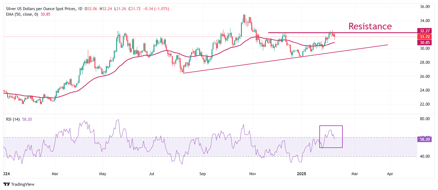 El precio de la Plata continúa enfrentando presión cerca de la resistencia inmediata de 32.50$, que se traza desde el máximo del 9 de diciembre. La perspectiva del metal blanco sigue siendo alcista ya que se mantiene por encima de la media móvil exponencial (EMA) de 50 días, que cotiza alrededor de 30.85$.