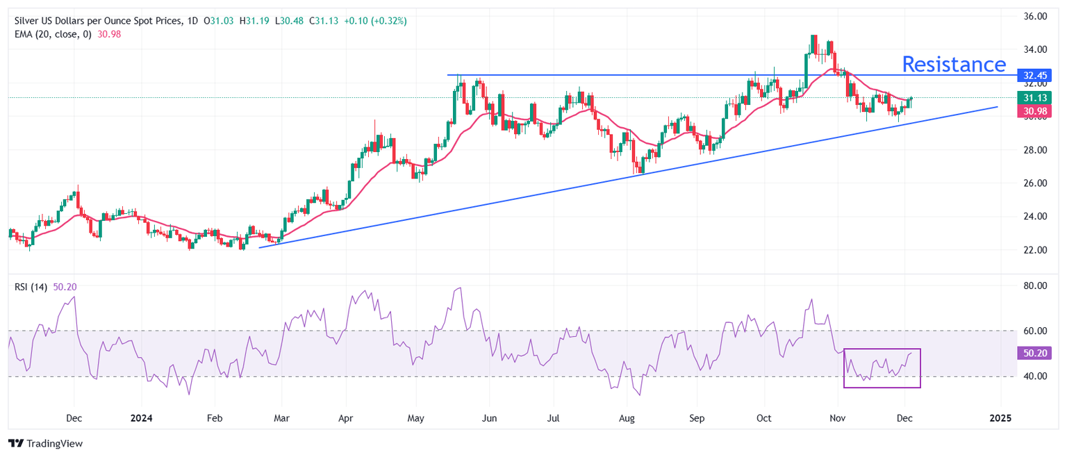 El precio de la Plata se esfuerza por extender la recuperación por encima de la media móvil exponencial (EMA) de 20 días, que cotiza alrededor de 31.30$.